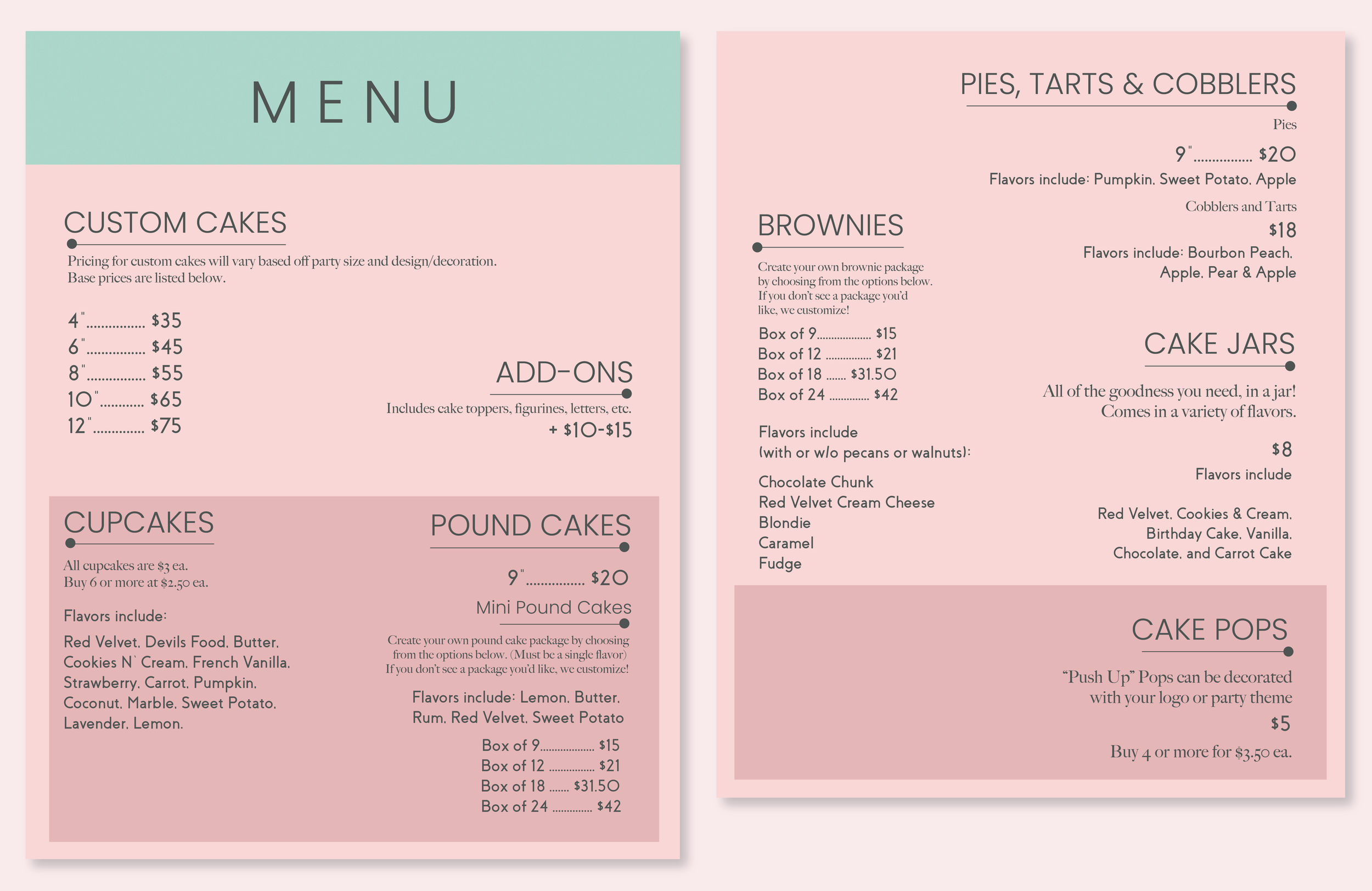 The following items can be shipped on the shop page: cookies, cake jars, brownies, cake pops, pound cake, and mini pound cakes.